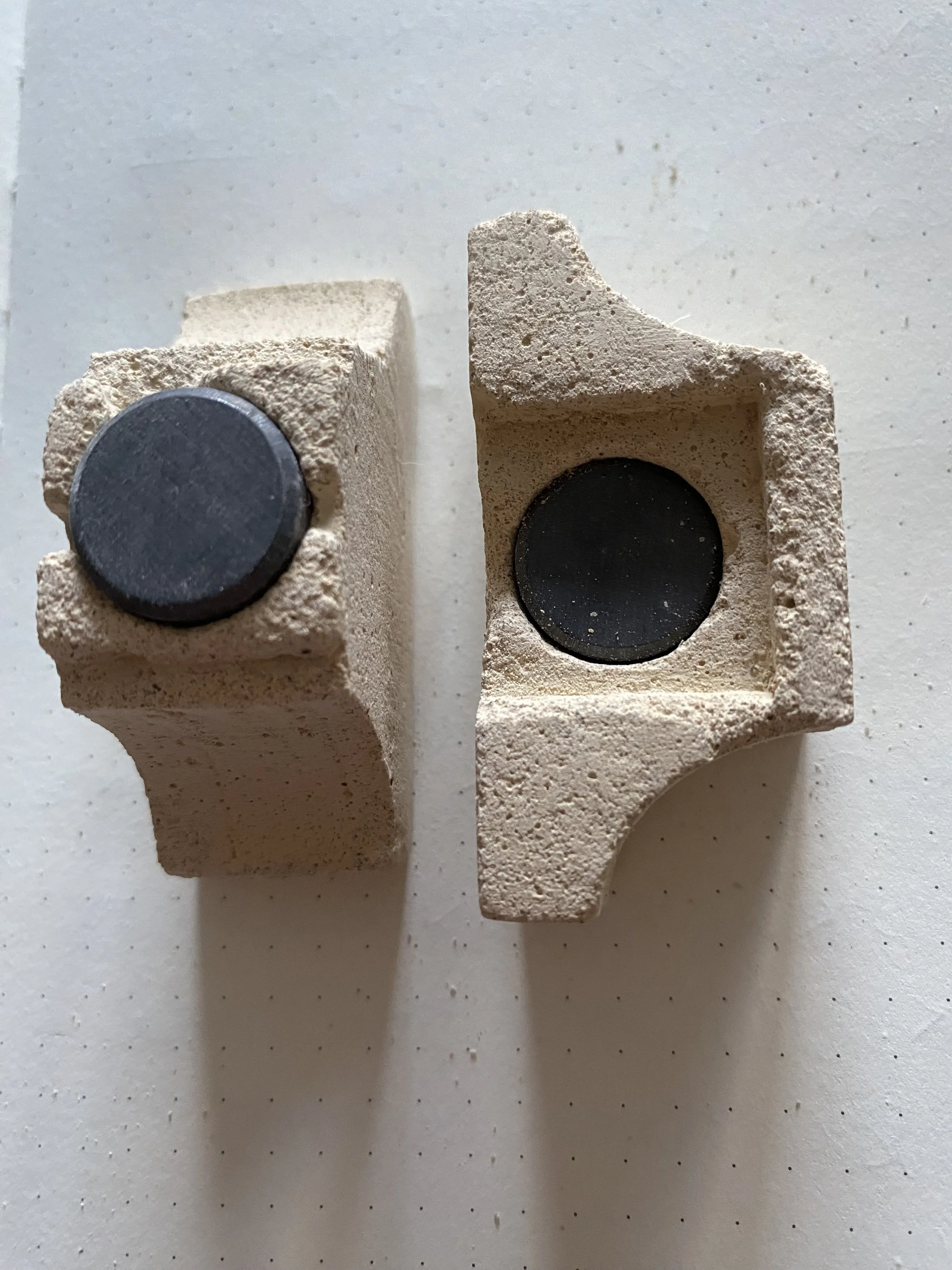 I brought with me a simple wooden prototype for a magnetic join — a two-part form designed to lock modular sheets together. At this stage, the form was intentionally basic. Its role was not to resolve the join, but to expose weaknesses once weight, surface and material resistance were introduced.