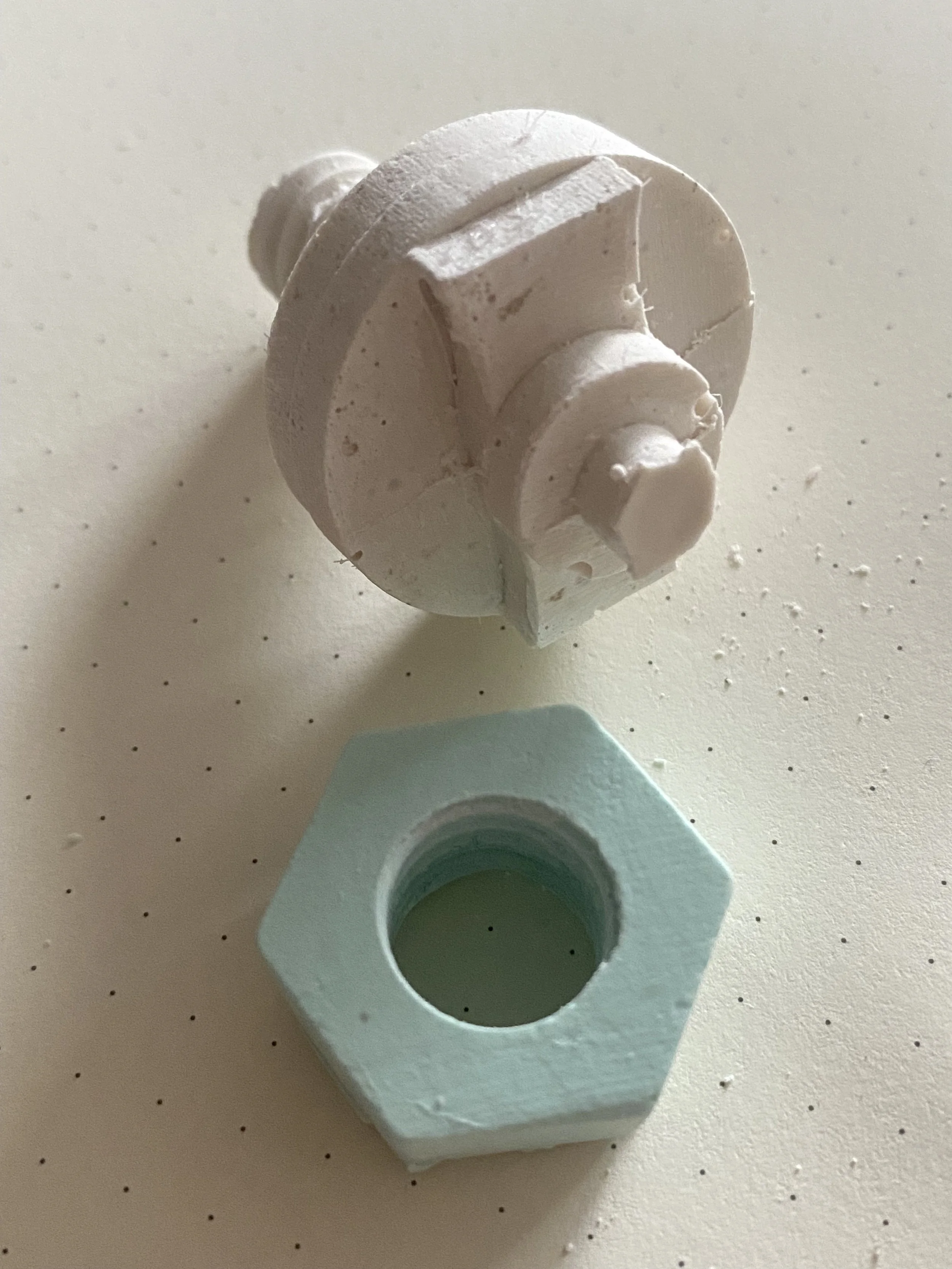 Jesmonite proved responsive but demanding. It captured fine detail easily and allowed for controlled colour integration, but it also made any weakness in the mould immediately visible. Air bubbles, seam lines and surface inconsistencies were not defects to be hidden; they were indicators of where the system was under strain.